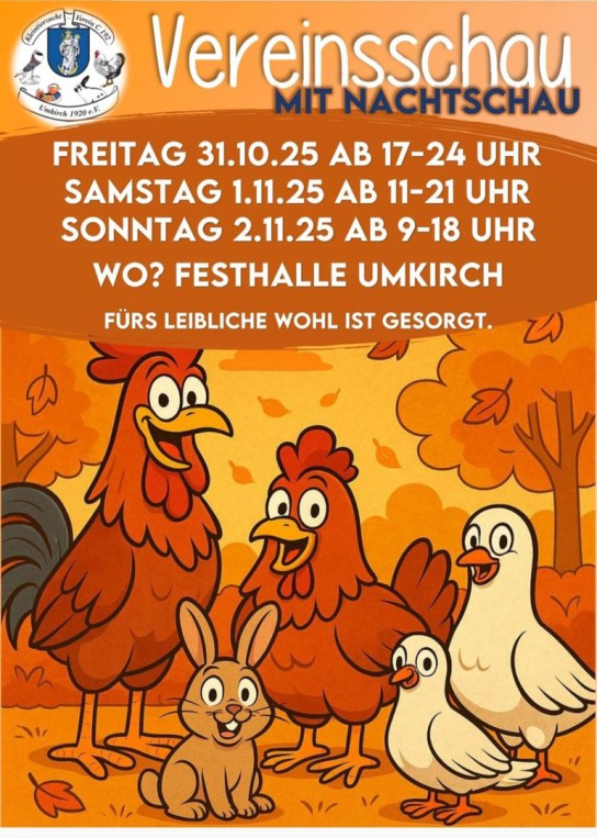 herbstliches Ambiente/ große und kleine Hühner, Kaninchen, Tauben und Ziergeflügel in natürlich und artgerecht gestalteten Volieren und Käfigen/ an allen 3 Tagen leckeres Essen/ Kaffee und Kuchen/ Nachtschau am Freitag 31. Okt. ab 17 Uhr mit Jubiläum-Rammler-Bar 105/ Samstag 01. Nov. (Feiertag) Mittagstisch ab 11 Uhr/ Sonntag ab 10 Uhr